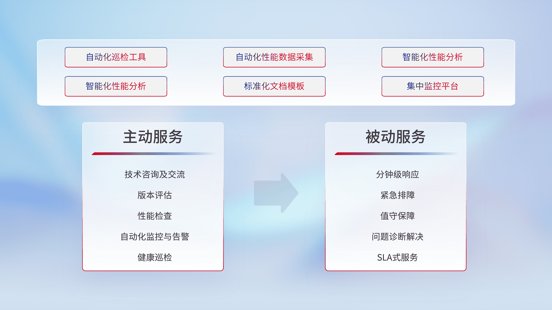 智能化工具和标准化文档,,,,保障服务质量,,提供主动服务(包含技术咨询、、版本评估、、、、性能检查、、、自动化监控与告警、、、健康巡检)和被动服务包含(分钟级响应、、、、紧急排障、、、、值守保障、、、、问题诊断解决、、SLA服务)。。。